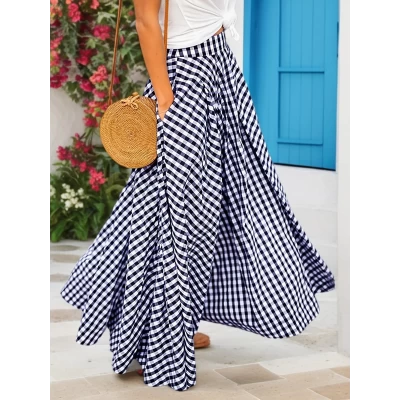 レディース エレガントチェック柄ミディスカート、ハイウエストスリミングフラーレンヘム、ポリエステル95% スパンデックス5% リニング、春/夏/秋のルーズフィット、ポケットデタイル付き、200gsm ウーブンファブリック